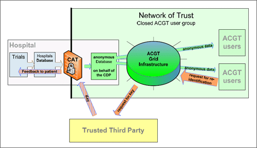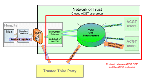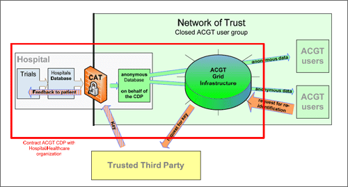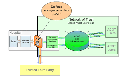 If a patient agrees to participate in an ACGT trial the physician transmits his or her data to an ACGT database located within the specific hospital, which is physically as well as organizationally disconnected from the hospitals database. During the transmission to the ACGT-database the genetic data will be de facto anonymized by a pseudonymization tool that guarantees an equivalent high standard for all genetic data transmitted from the participating hospitals to ACGT with the effect that all genetic data processed within ACGT is pseudonymized on a level that is state-of-the-art. ACGT will provide such a pseudonymization tool, but hospitals are not bound to use such tool, ACGT only can commit the hospitals by binding contracts to guarantee a state-of-the-art pseudonymization. The link of this pseudonymization is held by a security authority named "Trusted Third Party" (TTP). After this pseudonymization the data is stored in the ACGT database, possibly located in the hospitals or at the Trusted Third Party. In this moment the data are de facto anonymous. The de facto anonymous data and the links from the pseudonymization will be stored in different data bases. ACGT-end users will only work with de facto anonymous genetic data.