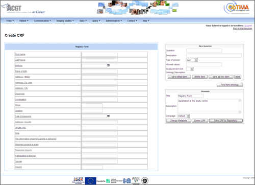 The output of the Trial Builder is a platform independent description of the metadata and the CRFs for the clinical trial. This description will be stored in an XML format that is based on the Operational Data Model (ODM) from the Clinical Data Interchange Standards Consortium (CDISC). ODM is a vendor neutral, platform independent format for interchange and archive of clinical trials data. The metadata of a clinical trial including a full description of the CRFs of the trial can be stored in the ODM format.