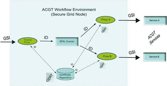 Apart from the security requirements, the need in ACGT for a standard workflow definition language lead to BPEL, from the business process management world, as the most prominent and well supported technology. Nevertheless, the choice of BPEL gave rise to more requirements and challenges. The first one is the provision of a user friendly workflow authoring environment. The second relates to the need for an infrastructure that would make possible the invocation of the ACGT secure grid services from inside the BPEL-based workflows, since BPEL and the Web Services standard security specifications do not deal with such requirements. Another major challenge comes from the wish to integrate into BPEL workflows non-ACGT services, which is by itself a complex technological task in many aspects, let alone the challenges due to the legal and security requirements.